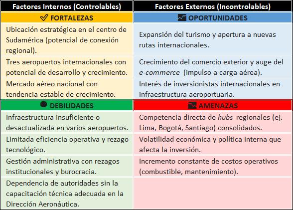 «El análisis FODA muestra que la principal estrategia (Maxi-Maxi) debe centrarse en aprovechar nuestra ubicación central (Fuerza) y el interés de inversionistas (Oportunidad) para superar rápidamente la insuficiencia de infraestructura (Debilidad) y establecer a Viru Viru como un hub para contrarrestar la competencia regional (Amenaza).»